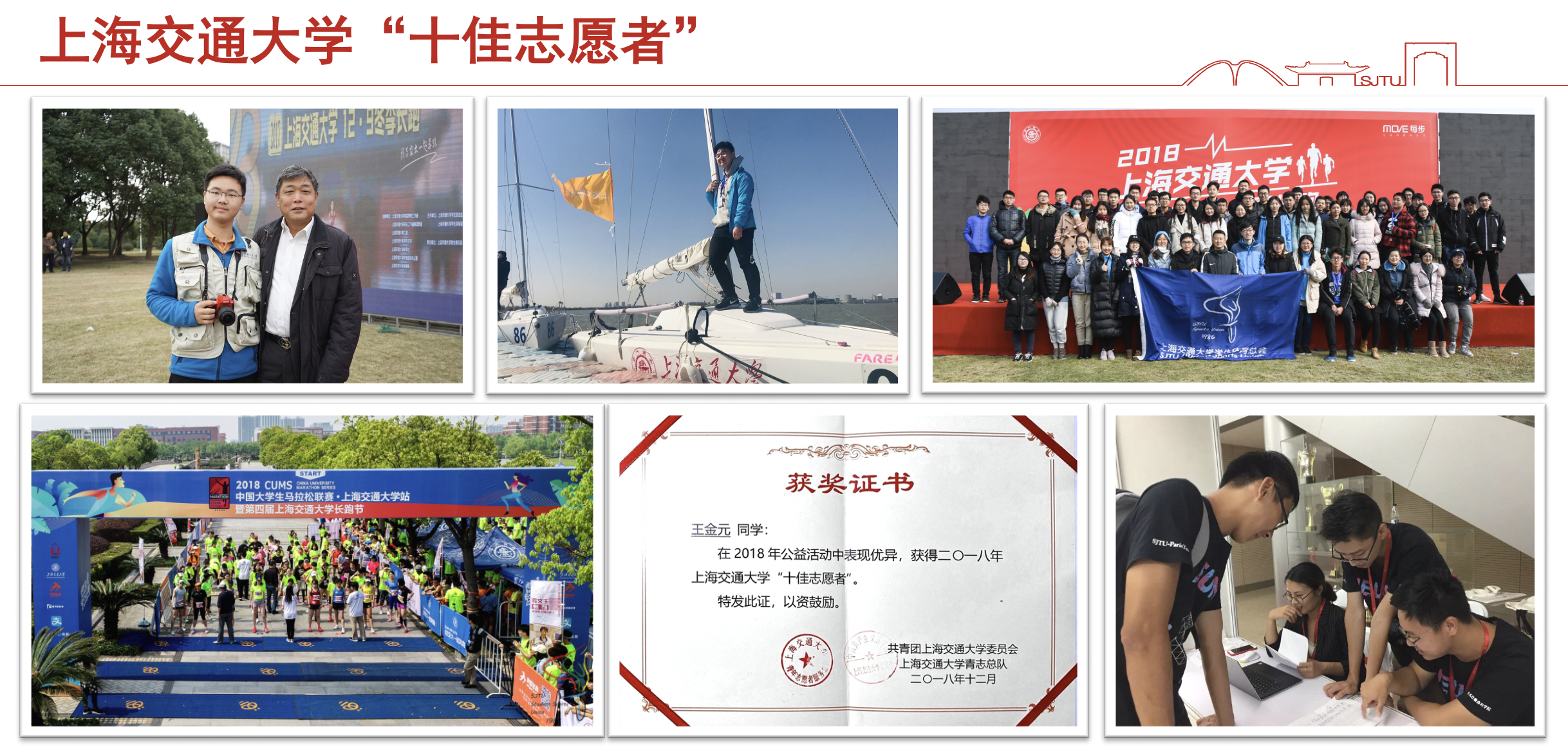2017-2018学年,金元参加校内志愿者活动十余次,累计学生工作超过1000小时,被评为上海交通大学“十佳志愿者”。
