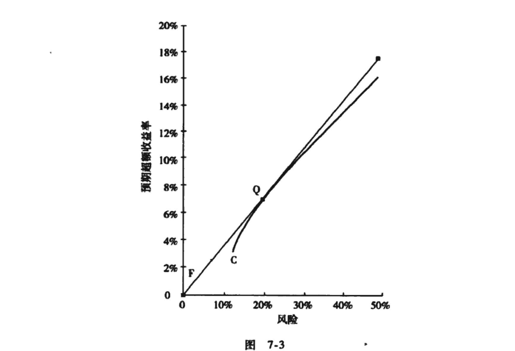对每一个投资组合,我们都为之确定一个风险,即其收益率的标准差;同时为之确定一个报酬,以其预期超额收益率衡量。图7-3中的组合Q具有最高的报酬-风险比率(夏普率)。