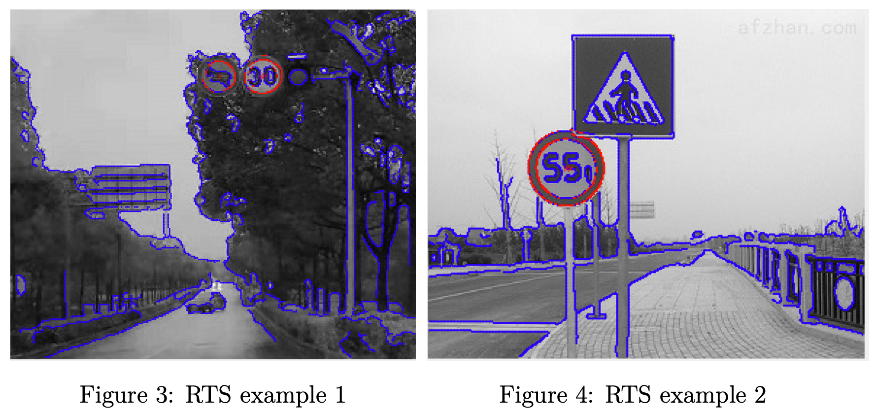 对于边缘检测,我们使用 Sobel 算子学习 Canny 边缘检测和 Harris 角检测器,并采用高斯滤波器和非最大抑制来降低噪声。 在实践中,我们使用圆形霍夫变换从检测到的边缘点中提取简单特征,以识别圆形道路交通标志 (RTS),如图 3 和图 4 所示。