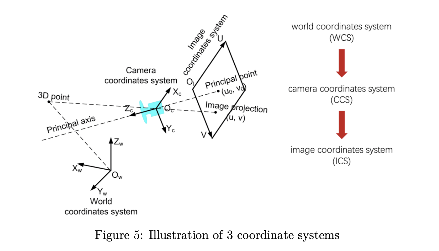 数码相机拍摄图像的过程实际上是一个优化成像的过程,涉及三个坐标系:世界坐标系(WCS)、相机坐标系(CCS)和图像坐标系(ICS)以及这三个坐标系的变换 如图5所示的系统。 WCS是客观三维世界的绝对坐标系。 由于相机被放置在三维空间中,我们需要一个参考坐标系来描述它的位置和其他物体的位置,用(xw,yw,zw)(x_w, y_w, z_w)。 CCS以相机模型的光心为坐标原点,其XX轴和YY轴分别平行于ICS的XX轴和YY轴。 我们使用 xc,yc,zcx_c, y_c, z_c 来表示对象在 CCS 中的位置。 ICS以图像平面的中心为原点,用(u,v)(u,v)表示图像上的一个位置。