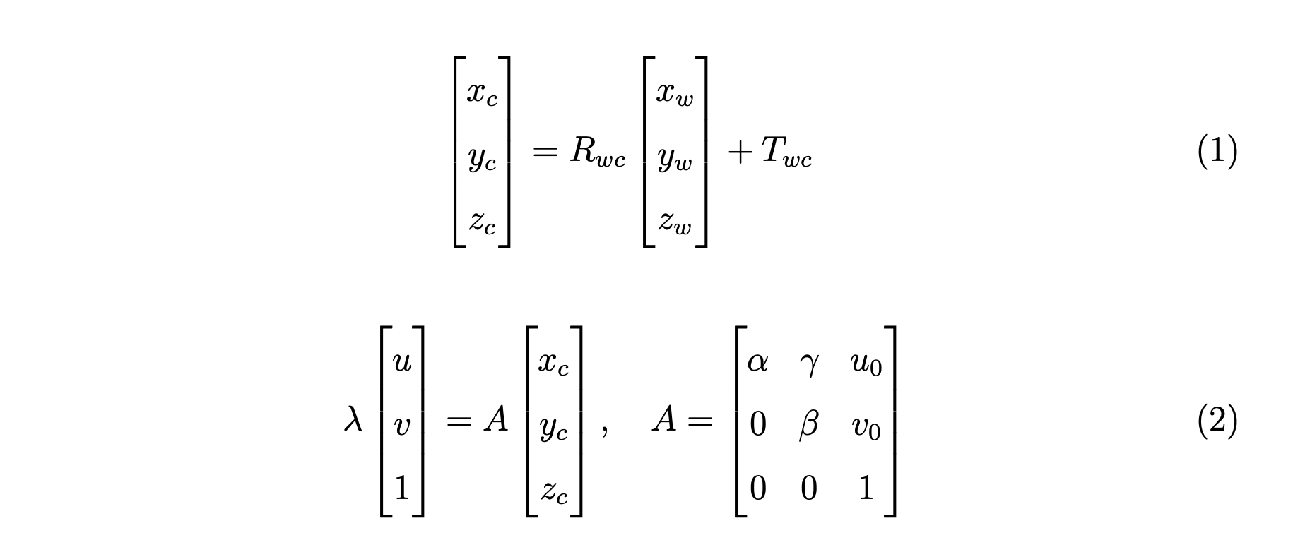 CCS 可以通过对 WCS 执行旋转操作和平移操作来获得,WCS 以方程1中的矩阵形式表示。 ICS 是通过在等式2中表示为 AA 的相机固有矩阵的投影获得的。
