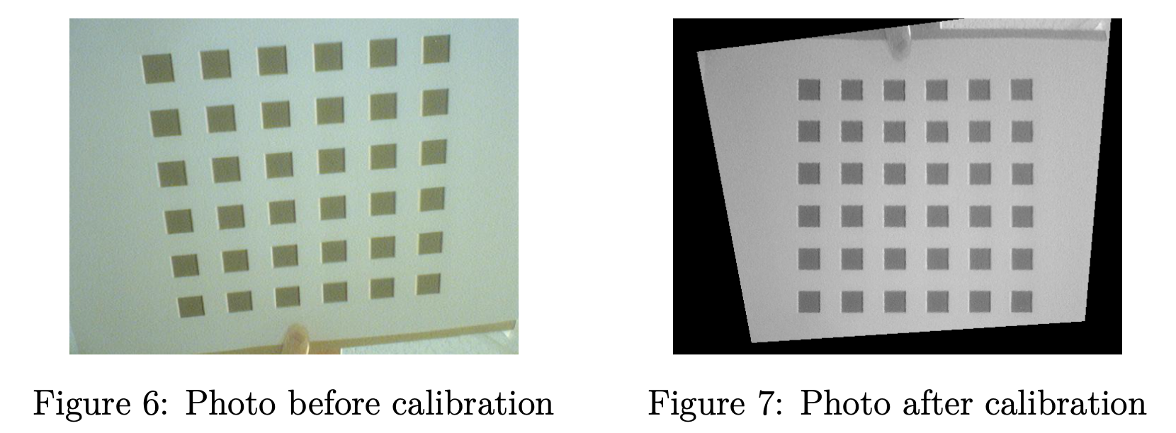 在实践中,我们实现了基于单应性理论的相机标定,对固有参数有两个约束,如图6和图7所示,我们还设法找到了相机固有参数矩阵由不同相机姿势的几张校准照片组成。