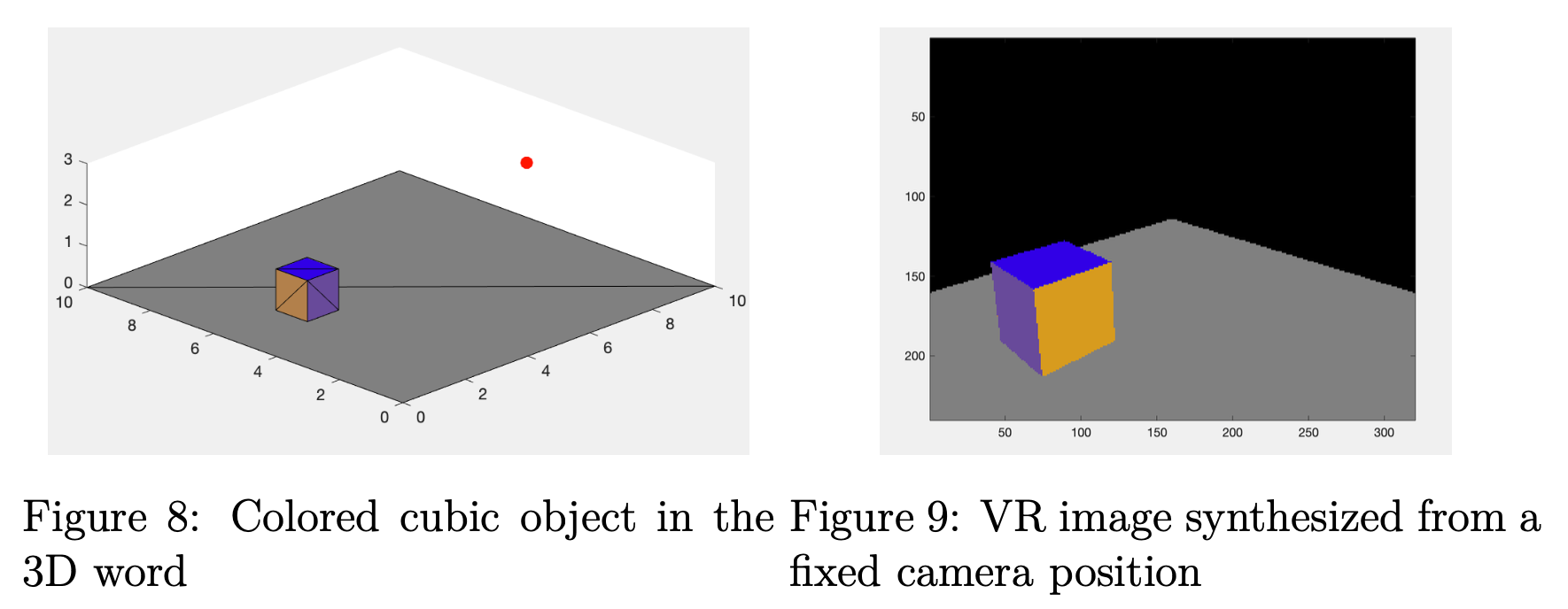 在 VR 中,想法是通过相机模型将现实世界的对象投影到图片上。 但是现实世界不能分解成有限个点,所以我们无法一一求出每个点在图片上的投影。 而是通过相机模型投影后判断图片上的每个像素点是否在物体上,这样会大大减少计算量。 我们将物体分解成有限个不重叠的三角形区域,然后判断一个像素点的投影是否在每个三角形区域内,这样我们不仅可以判断一个像素点的投影是否在物体上, 还要在物体的哪个面上。 图8和图9显示了一个说明性的 VR 实践,其中我们从固定的相机位置(红点)合成彩色立方体对象的 VR 图像。