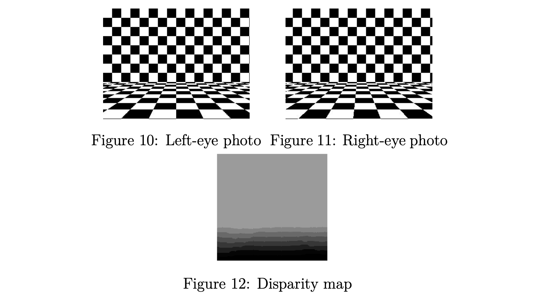 立体视觉需要双目视觉,所以我们需要两个摄像头。 为了在两个相机图像中找到对应的对象,我们使用对极线约束来缩小搜索区域,并使用平方差和(SSD)算法建立对应关系,即匹配具有相同分布的区域。为了简化,我们一般选择保持两个相机之间的轴与水平轴对齐。 立体视觉允许我们测量图像中的距离,也称为场景深度。作为实践,我们使用两张照片建立虚拟场景的立体视差图,如图10、11和12所示。 在视差图中,暗度表示与相机的距离,越暗表示越近。