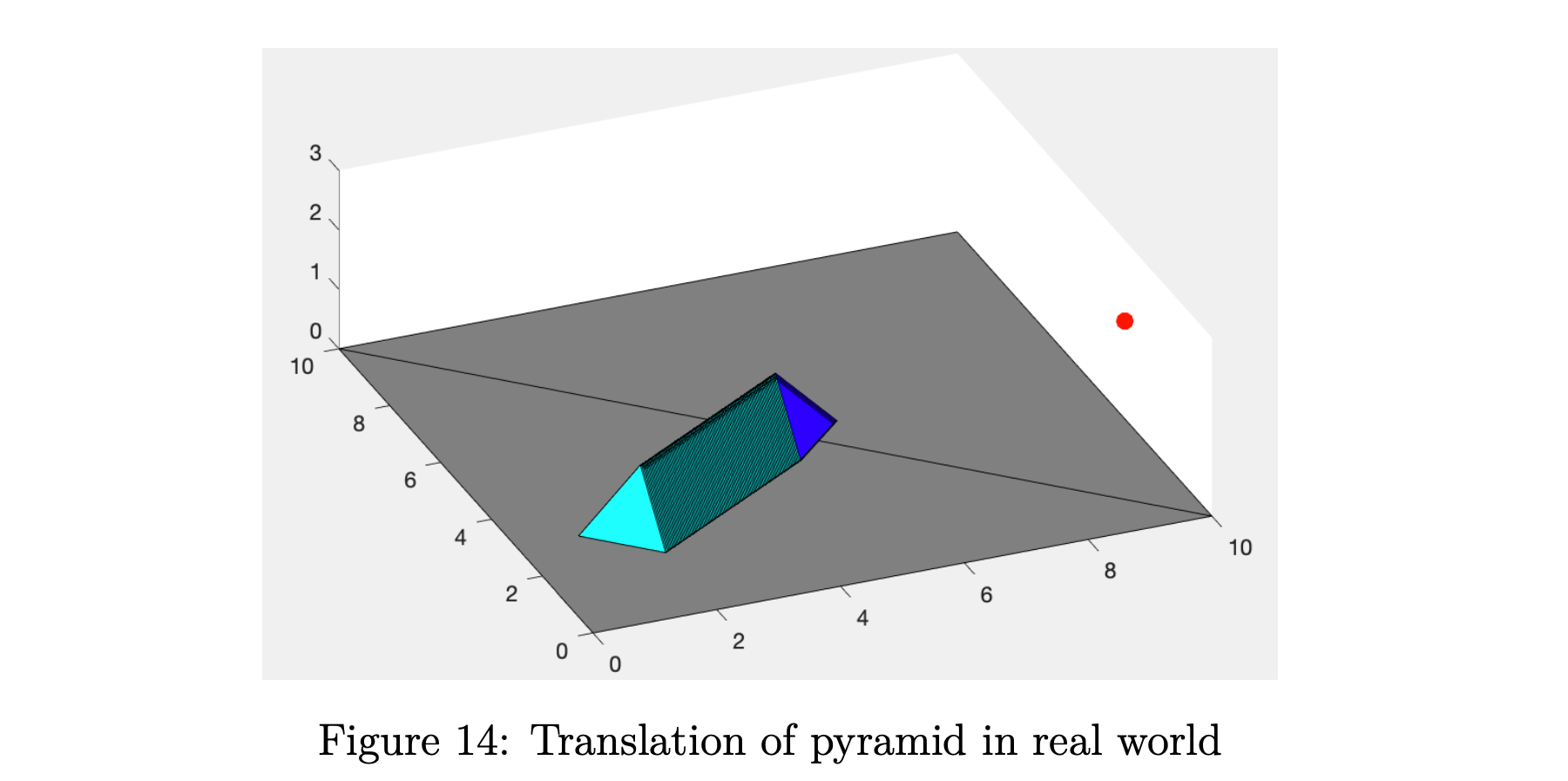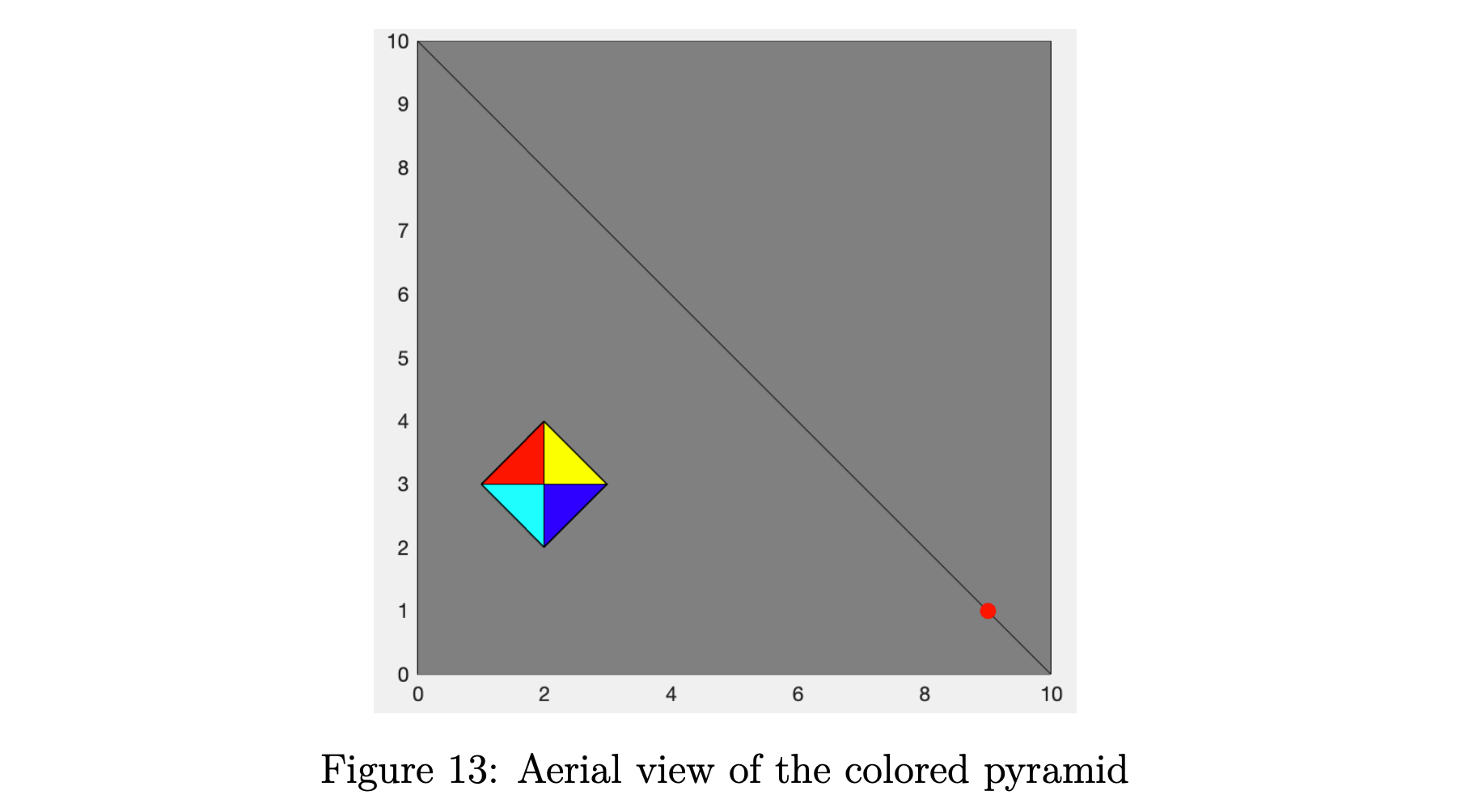如图 13 所示,我的对象是一个彩色金字塔,可以用 5 个端点 (1,0,0)(-1,0,0), (0,1,0)(0,1,0), (1,0,0)(1,0,0) 表示 , (0,1,0)(0,-1,0)(0,0,1)(0,0,1)。 相机放置在红点位置。