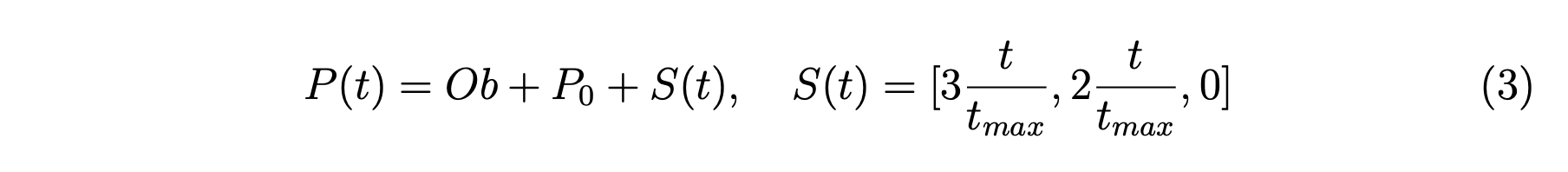 在我们的代码中,金字塔的位置由原始的金字塔坐标ObOb和一个初始位置向量P0P_0组成,其中ObOb是5个端点(1,0,0)(-1,0,0)的集合, (0,1,0)(0,1,0)(1,0,0)(1,0,0)(0,1,0)(0,-1,0)(0,0,1)(0,0,1)。 为了添加平移运动,我们只需要添加一个位移向量 S(t)S(t),它是时间 tt 的函数。 在我们的实验中,我们简单地选择从初始位置到世界中心的线性位移。 让我们将金字塔的位置表示为 P(t)P(t),它是 5 个端点的集合,总时间跨度为 t{max}t_\{max\}。 所以 P(t)P(t) 可以用方程 3 表示。