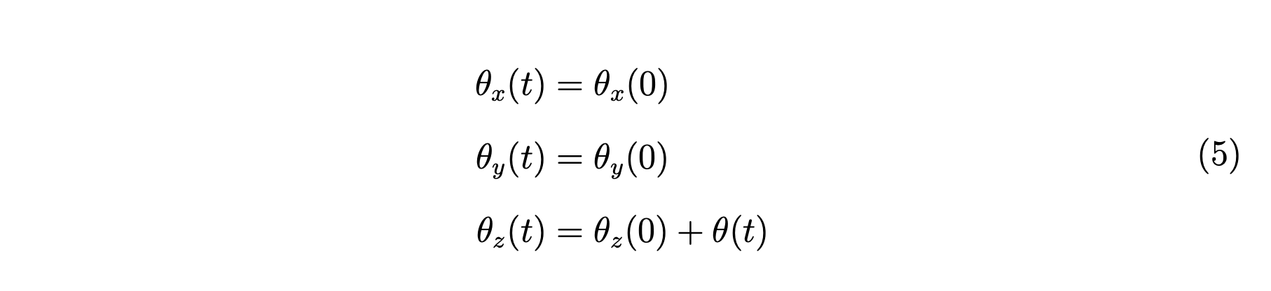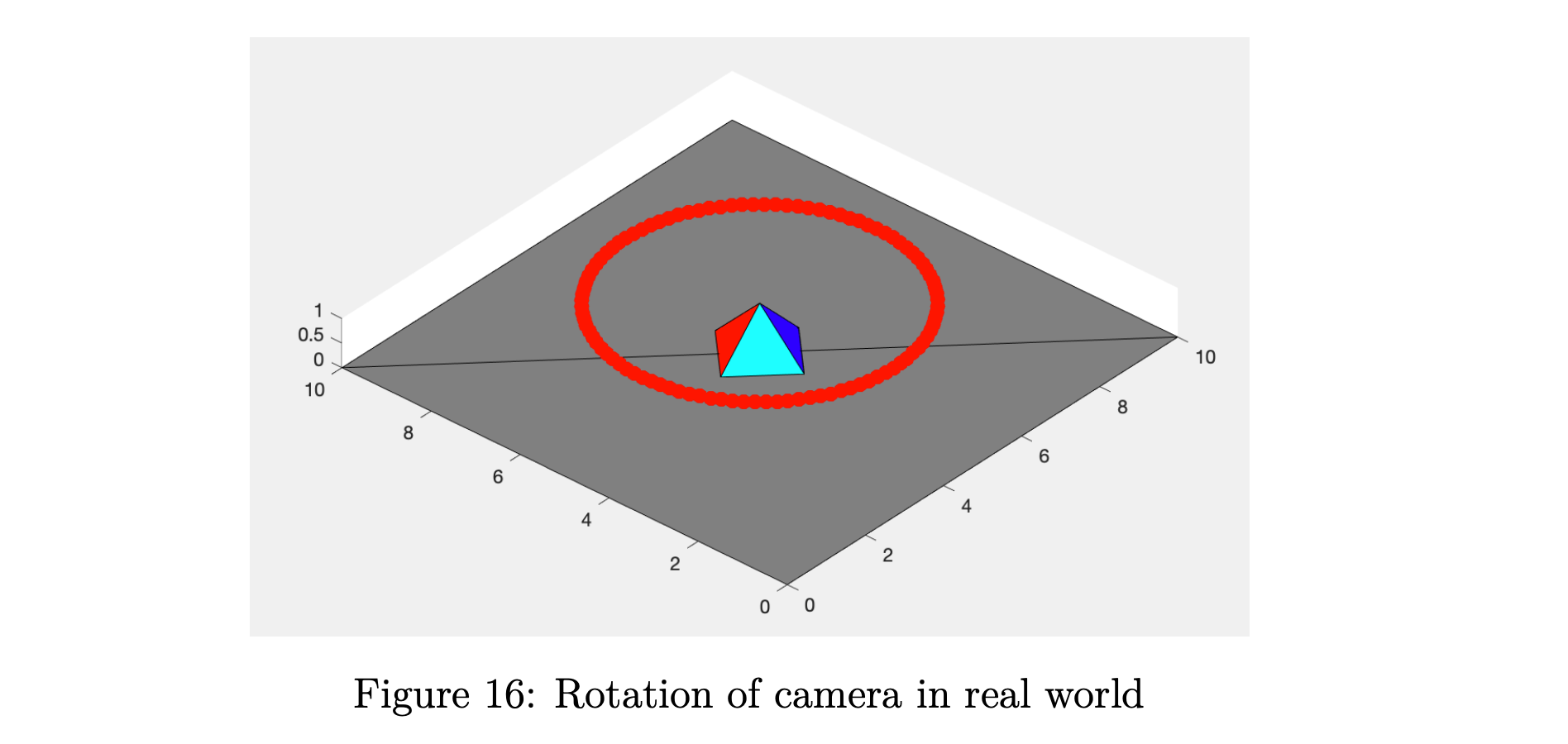 在这部分中,我们将金字塔的位置固定在世界中心 (5,5,0)(5,5,0) 上,我们围绕它旋转相机,同时保持相机指向金字塔。 在我们的代码中,相机位置由变量 camT(t)camT(t) 控制,我们添加相机的旋转,如方程式 4 所示。 指向角由 θx\theta_xθy\theta_yθz\theta_z 控制,其中 θx\theta_x 分别是围绕 XX 轴和其他轴的旋转角度。 由于我们的相机仅在 XOYXOY 平面内旋转,因此我们的角度控制如方程式 5 所示。