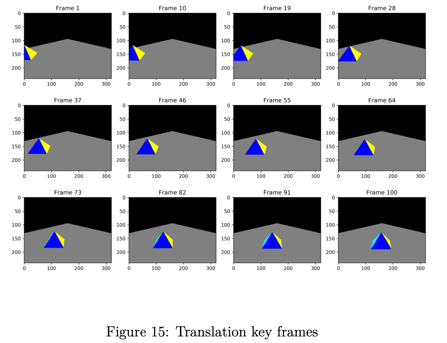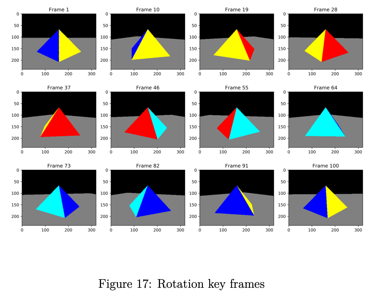 我们金字塔的平移如图 14 所示,一些关键帧如图 15 所示。我们相机的旋转如图 16 和一些关键帧如图 17 所示。 在所有图中,红点代表相机位置。 对于每个实验,我们渲染 101 帧,我们的合成 .gif 文件每秒 24 帧,以获得良好的视觉体验。 有关详细信息,请查看代码和我们的 .gif 文件。